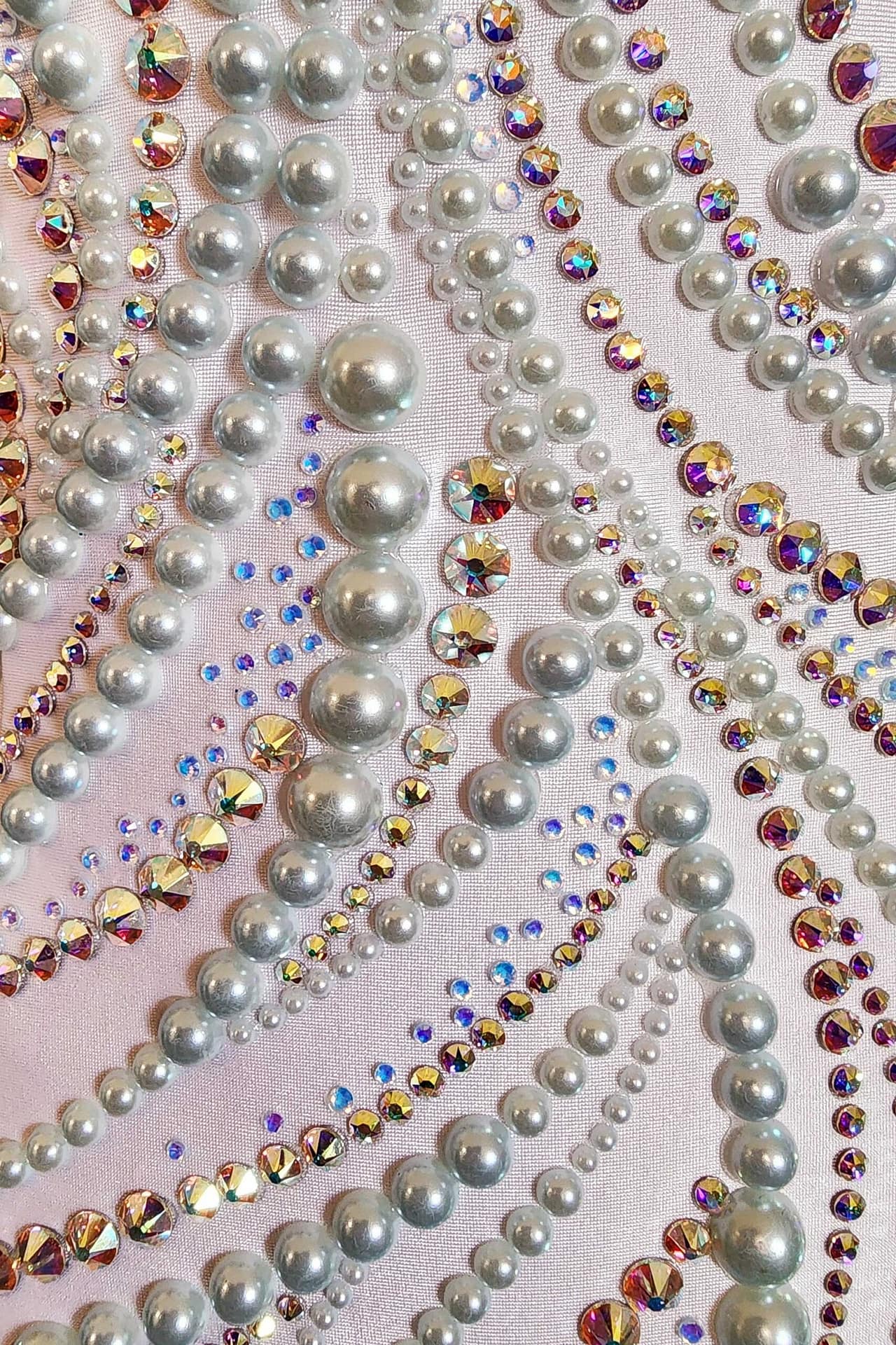 The body of the dress is a visual masterpiece, adorned with swirling lines of pearls and Swarovski crystals. The combination of different-sized pearls and crystals creates an almost hypnotizing effect, ensuring all eyes are on you as you gracefully move across the dance floor. Elevate your performance with the allure of Cyra, where artistry and movement converge in a breathtaking dance ensemble.