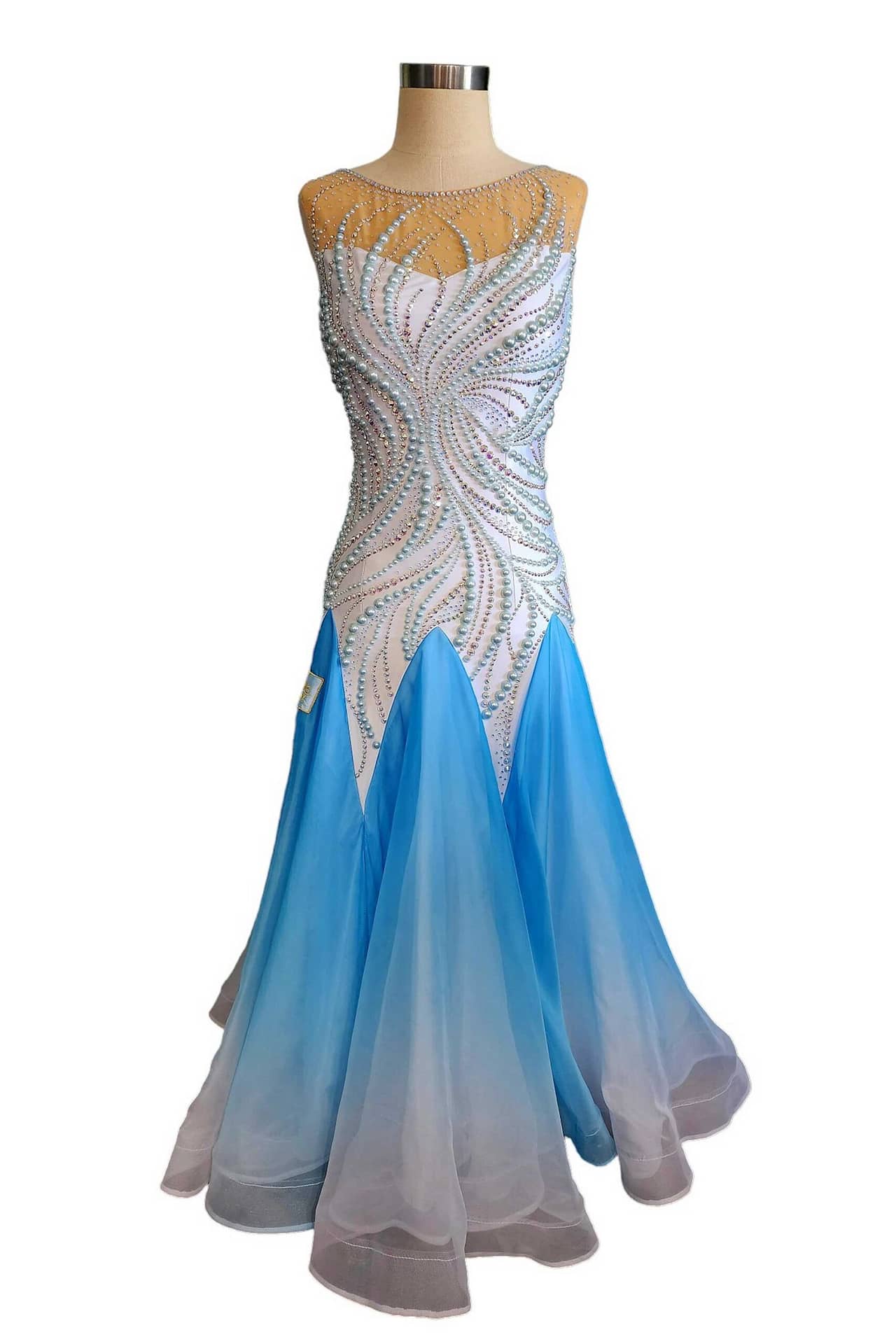 Introducing Cyra, a spellbinding professional ballroom dress designed for sizes 4-6. This captivating ensemble features a pristine white body that exudes elegance, while the mesmerizing blue ombre skirt gracefully transitions to a pure white at the hem. Cyra comes to life with an added touch of versatility through detachable floats, mirroring the enchanting ombre effect for a dynamic dance experience.