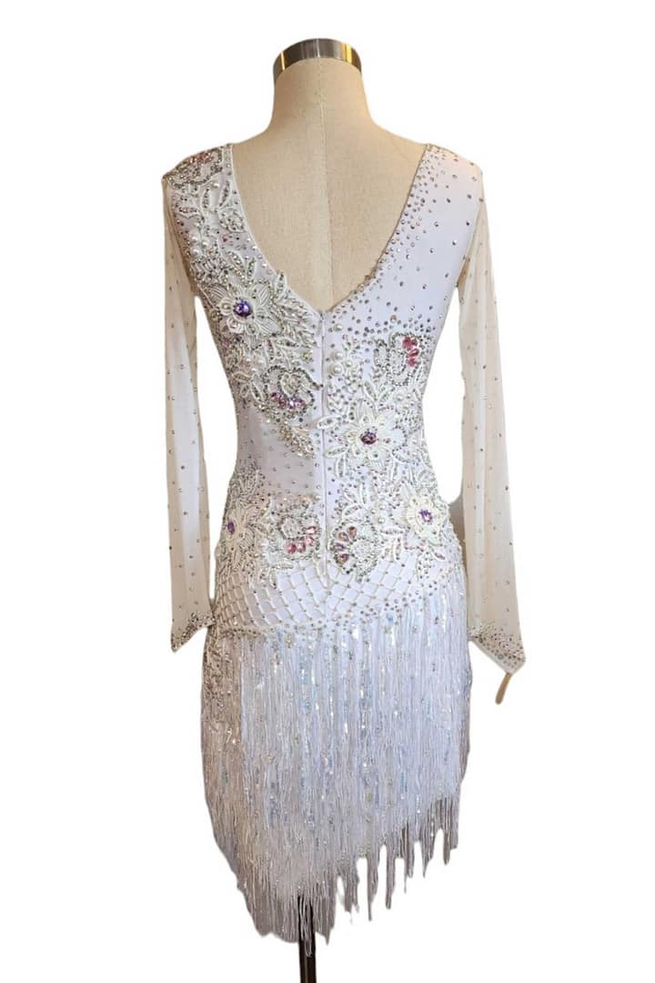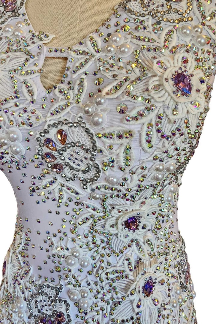 Introducing “Dani,” a captivating handmade Latin dance costume tailored for ballroom competitions in sizes 4-6. This all-white ensemble transcends elegance with its intricate details. Adorned with 3-dimensional white embroidered appliques, embellished with a myriad of multi-color crystals, “Dani” is a symphony of sophistication.