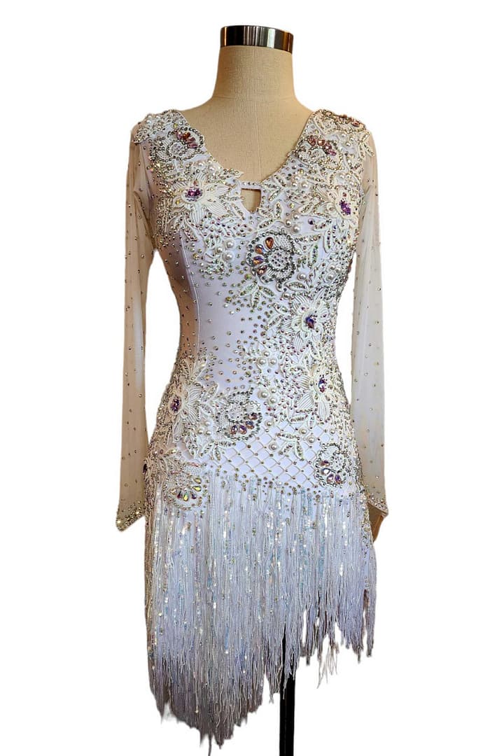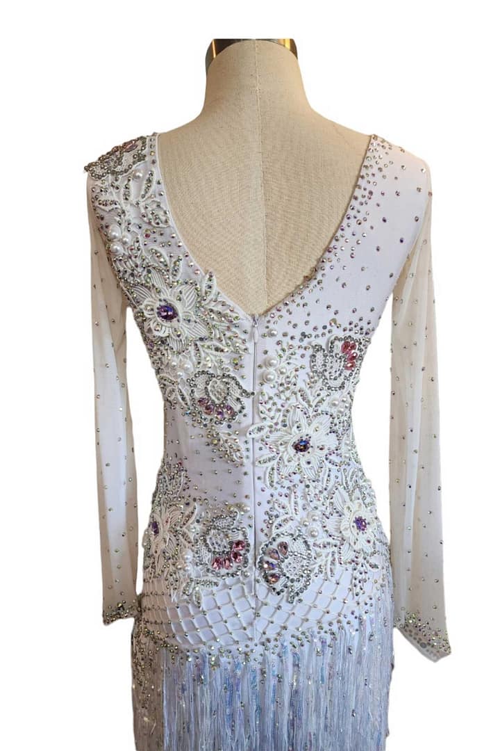 The dress features a unique design element—an open cross pattern of squares sweeping diagonally across the front. Paired with the delicate interplay of glass and micro sequin fringe, this costume is a true work of art, destined to command attention on the dance floor.