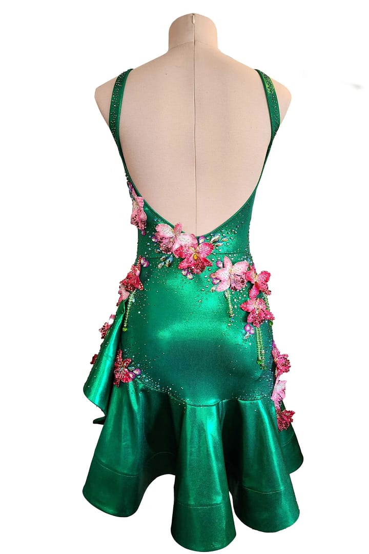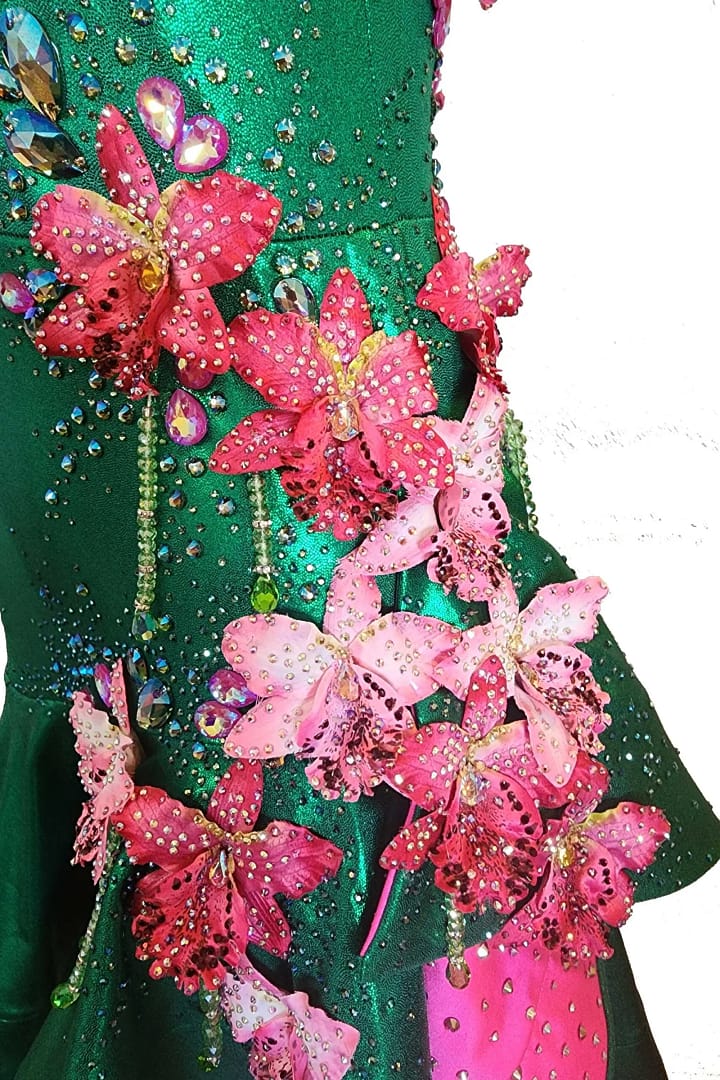 Orchid is an enchanting Latin ballroom costume designed to radiate color, movement, and elegance. Its vibrant green satin base is adorned with clusters of three-dimensional orchid flowers on both the front and back, creating a lush garden effect that commands attention. Soft strands of light green glass firing hang from select blooms, adding whimsical motion with every step.