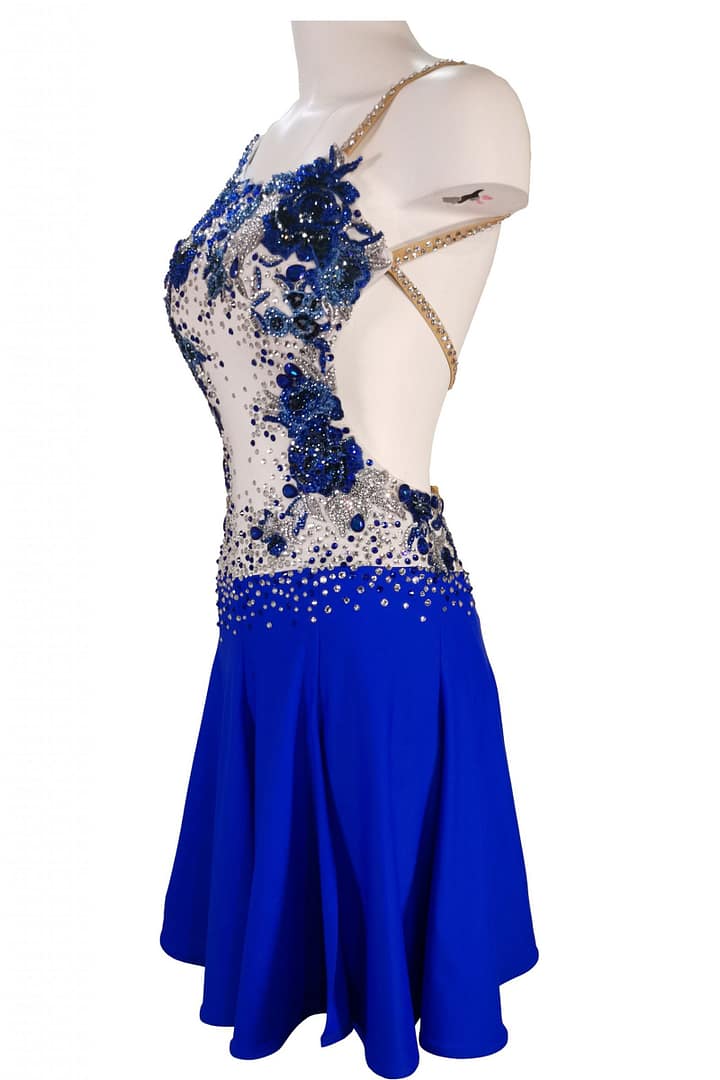 Elevate your performance with Manon, a captivating professional ballroom Latin dance dress. This exquisite costume is a symphony of blue and white, creating a visual harmony that’s both elegant and eye-catching. The bodice is adorned with a sparkling array of blue and clear crystals in various sizes, glistening with every movement and drawing all eyes to you. The intricate embroidered floral appliqué weaves its way across the costume, adding a touch of nature’s beauty to the sophisticated design. The skirt, designed with a flattering slit, allows for full expression of your dance moves, enhancing your leg lines and adding an extra dimension of allure. With an open back framed by crystal straps, Manon offers a balance of boldness and grace, ensuring you feel as stunning as you look. Manon is the perfect choice for the dancer who embodies poise and wants to leave a lasting impression on the dance floor.
