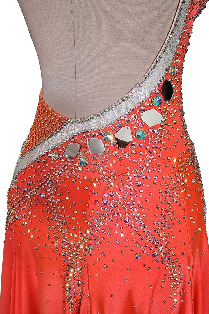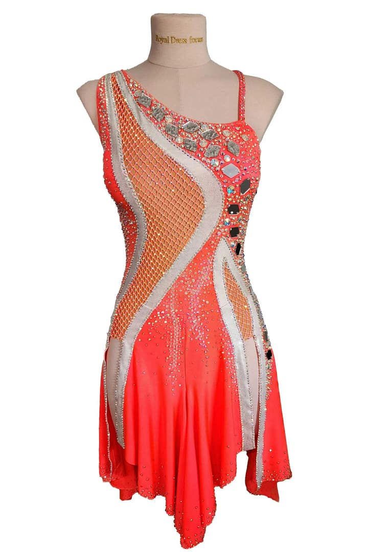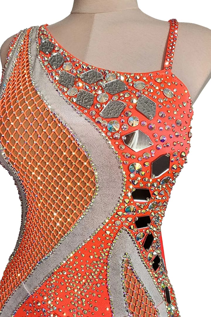 Sola is a radiant professional Latin ballroom costume created for dancers who want to command the spotlight. This striking orange design is engineered for both beauty and performance, featuring highly reflective mirror accents placed strategically to catch and amplify stage lighting. Athletic elastic mesh shapes the bodice and provides secure support, with crystals at every crossing point for added refinement and sparkle.