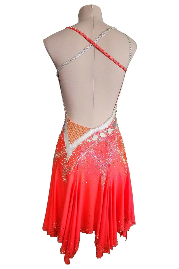 The design flows seamlessly to the back, maintaining its bold mirrored pattern while revealing a dramatically open back that enhances movement and allure. With generous crystal embellishment and a flowing Latin skirt, Sola delivers bling, brilliance, and powerful flair—making it the perfect choice for dancers who perform with passion and soul.