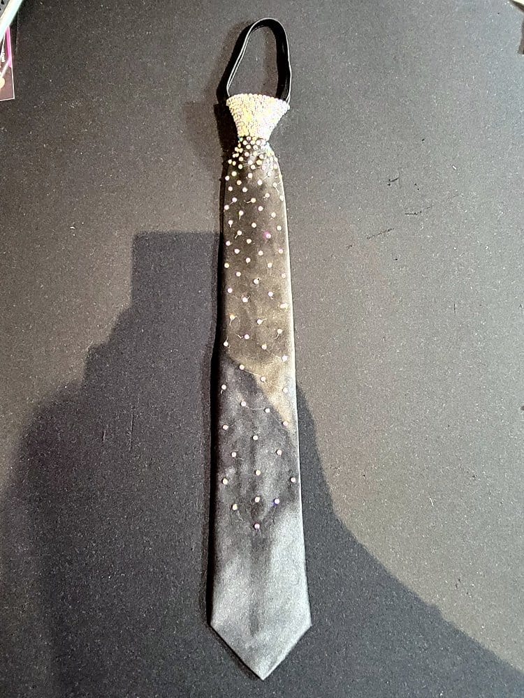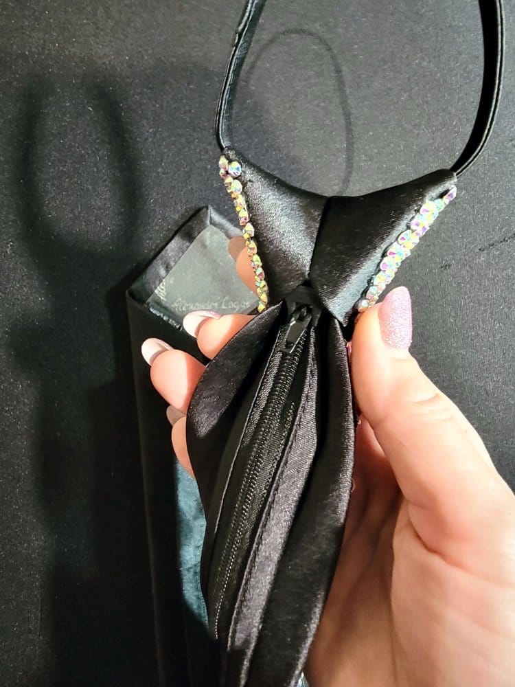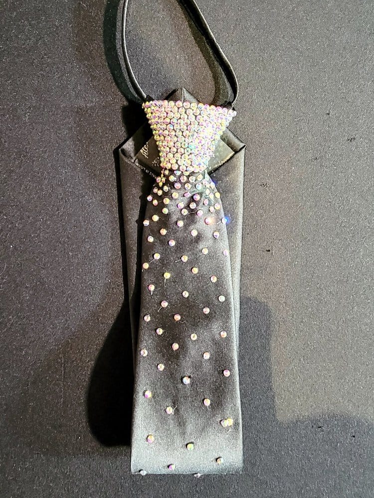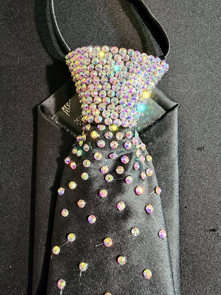 Our ties are designed so you can match the color of your dress with the tie. Ladies, these make a perfect Xmas gift for your dance partner. Our ties have an easy zip knot that makes putting it on and getting it in position super easy. Just slide the know up and down as if it were on a zipper. Need a custom designed tie? We can do it with enough advance notice. Contact us for more information on this option.