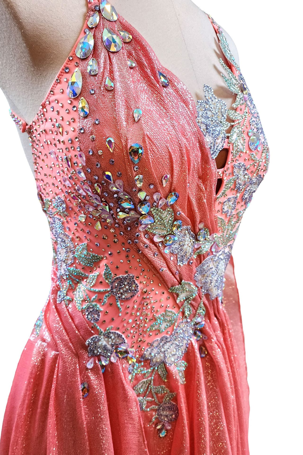 Elevate your dance with our exquisite ballroom dress handcrafted with real silk chiffon in a breathtaking coral hue. Designed for sizes 6-8, this gown combines timeless elegance with contemporary flair. Thousands of meticulously placed crystals adorn the dress, ensuring you sparkle and shine with every movement on the dance floor. Immerse yourself in the luxurious feel of silk chiffon, and let the radiant coral color and dazzling crystals make a statement of glamour and sophistication. Step into the spotlight with this uniquely crafted dress that seamlessly blends comfort, style, and a touch of dazzling allure.